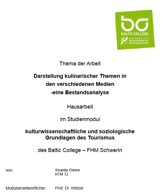 Das Zusammenspiel aus Kulinarik und Medien stellt einen wichtigen Punkt für neue Essgewohnheiten und die Verbreitung von Esskulturen der verschiedenen Länder dar. Diese belegte die Stundetin des Baltic College – FHM Schwerin Swantje Dieme mit ihrer Hausarbeit zum Thema „Darstellung kulinarischer Themen in den verschiedenen Medien -eine Bestandsanalyse“